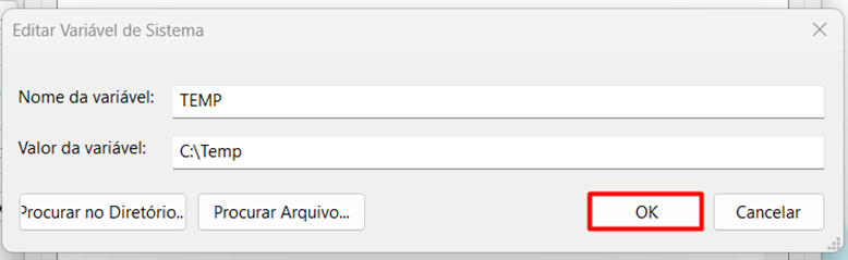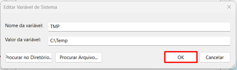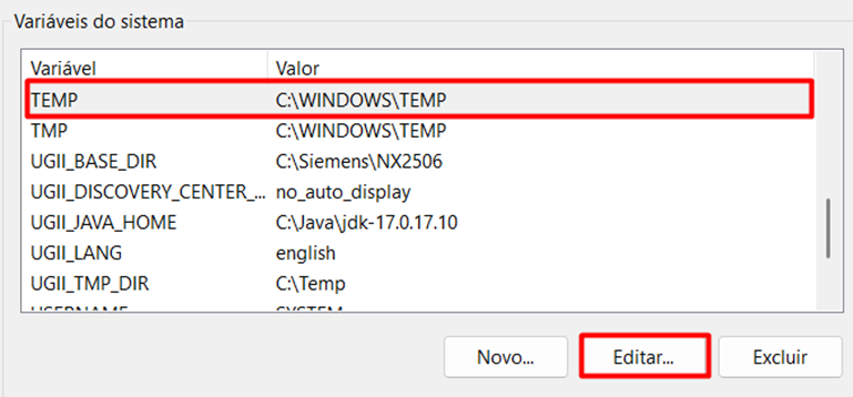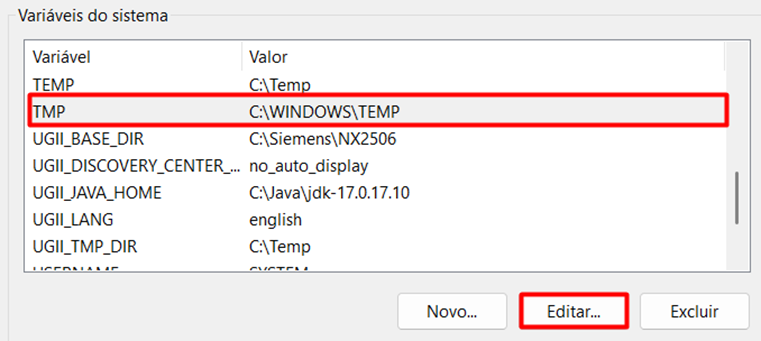 f) Em Variáveis do sistema busque por TMP selecione e clique em Editar;