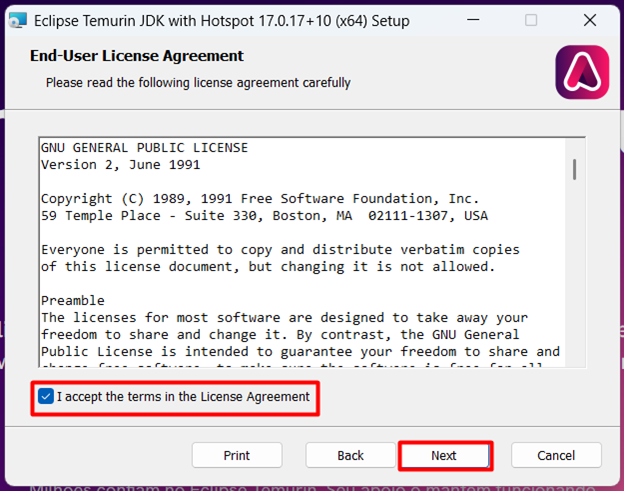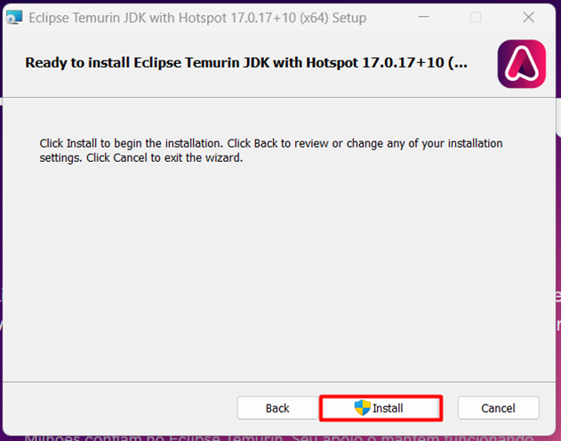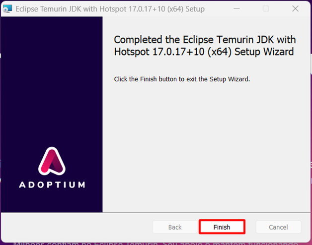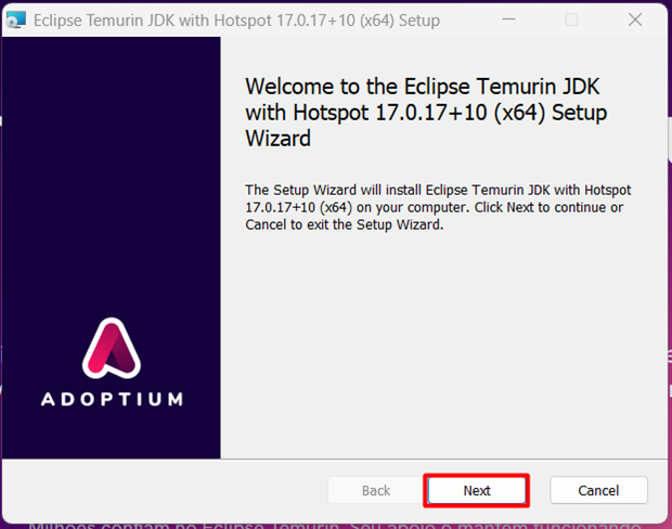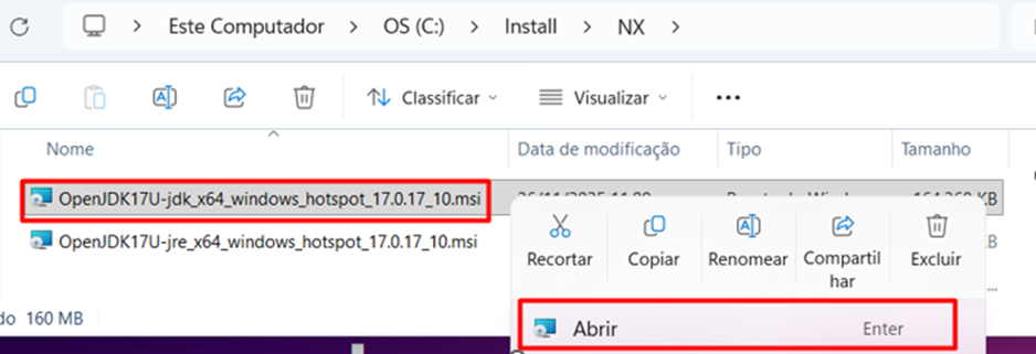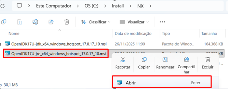 a) Clique com o botão direito sobre OpenJDK17U-jdk_x64_windows_hotspot_17.0.17_10.msi e clique em Abrir;