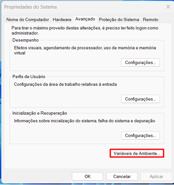 b) No menu iniciar do Windows busque por Editar as variáveis de ambiente do sistema;