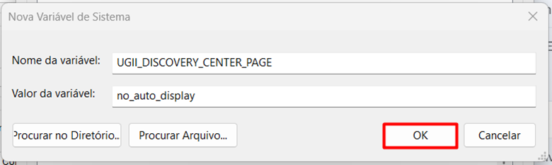 d) Crie a Variável: UGII_DISCOVERY_CENTER_PAGE=no_auto_display;