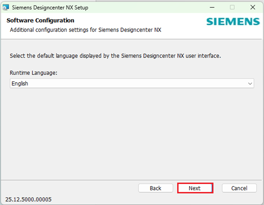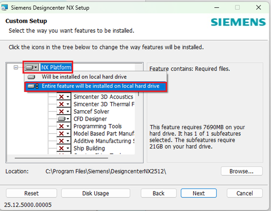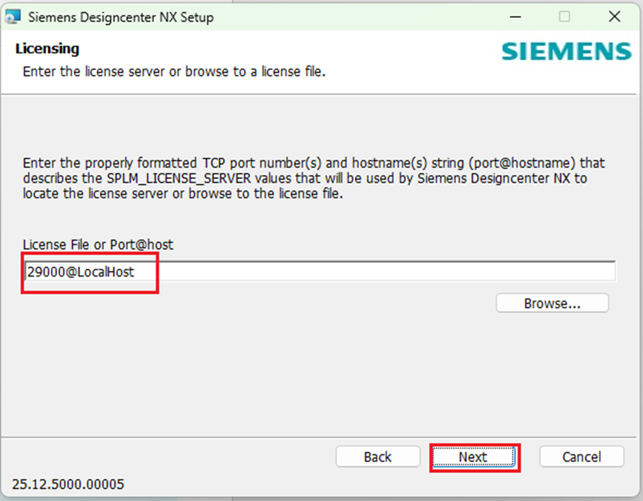 h) Clique em Browse e defina o caminho da instalação como C:\Siemens\NX2512\;