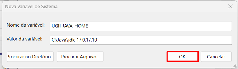 f) Crie a Variável: UGII_JAVA_HOME= C:\Java\jdk-17.0.17.10;