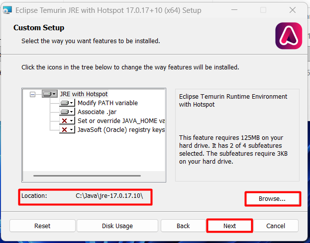 m) Clique em Browse e defina o caminho da instalação como C:\Java\jre-17.0.17.10;