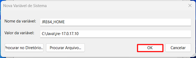 f) Crie a Variável: JRE64_HOME= C:\Java\jre-17.0.17.10;