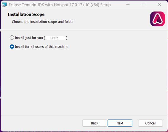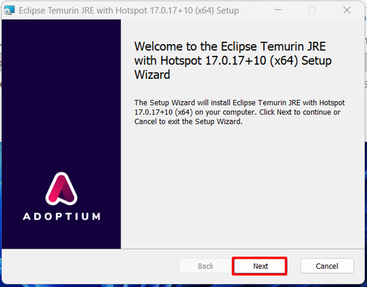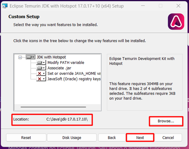 e) Clique em Browse e defina o local de instalação como C:\Java\jdk-17.0.17.10;