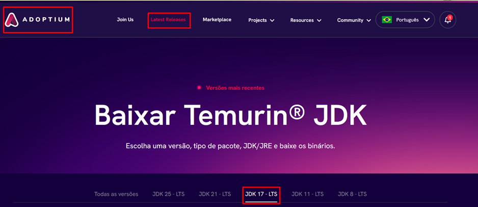 a) Acesse o Adoptium pelo navegador e selecione Latest Releases;