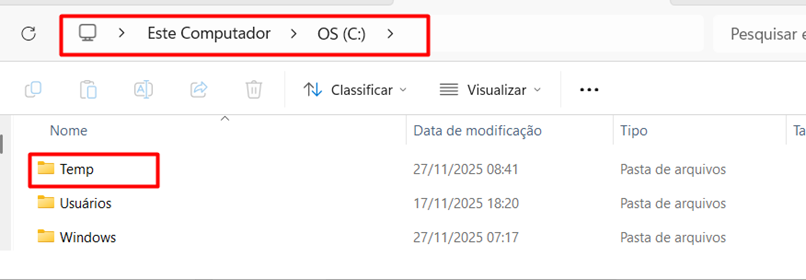 a) Caso não exista crie uma pasta Temp em C: (C:\Temp);