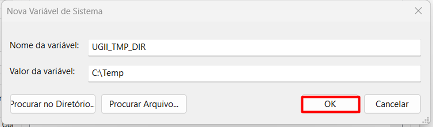 h) Crie a Variável: UGII_TMP_DIR=C:\Temp;